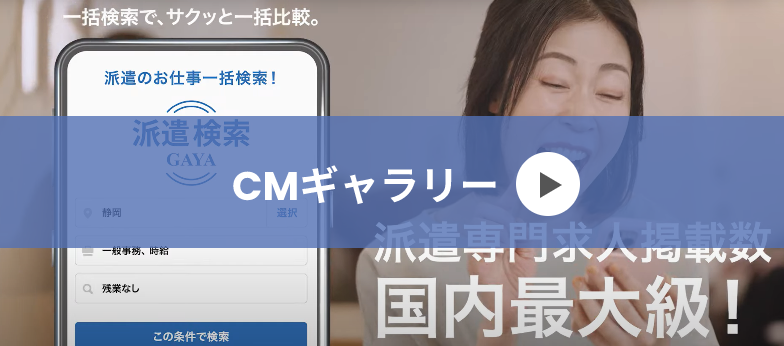 「派遣検索GAYA」は、Man to Man株式会社が運営する日本最大級の派遣専門求人情報サイトです。主要求人サイトから「派遣の仕事」だけをまとめて掲載していますので、複数 の求人媒体を見て回る必要がなく、 仕事・転職・採用情報を簡単に探せます。東京・大阪・兵庫をはじめ、47都道府県の各地域からお近くの求人情報をチェック可能。日雇いや短期雇用で働きたい方、長期雇用で働きたい方など、自分に合った仕事をぜひ「派遣検索GAYA」で見つけてください。